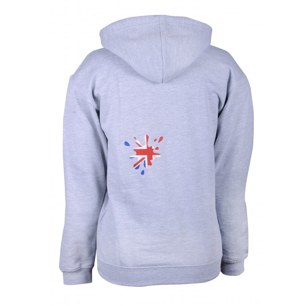 Soft grey hoodie with Union Jack splodges printed on the front and back. Designed and printed here in the UK exclusively for us at Union Jack Wear.